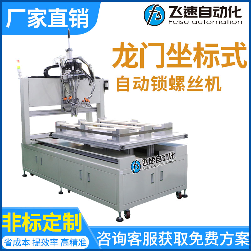 本案例是鎖卡板上的螺絲,由于產(chǎn)品比較大,所以采用伺服龍門坐標(biāo)式自動(dòng)鎖螺絲機(jī),產(chǎn)品用獨(dú)立升降氣缸鎖付,機(jī)器共有6個(gè)軸,一次可以鎖6顆螺絲。