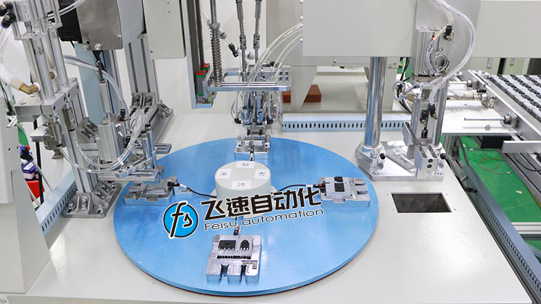 本案例采用2軸轉(zhuǎn)盤機械手帶點膠自動鎖螺絲機,第一工位人工將散熱器和三極管放到夾具,第二工位點膠,第三工位吸三極管鎖螺絲,第四工位機械手取出到輸送帶上。鎖螺絲的位置根據(jù)不同規(guī)格散熱器螺絲孔位可調(diào)。