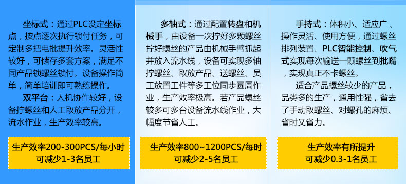 • 產(chǎn)品簡介: 桌面坐標(biāo)式XYZ三軸自動(dòng)送鎖螺絲機(jī),使用單伺服電機(jī)實(shí)現(xiàn)高精度自動(dòng)打螺絲,左右雙夾具平臺(tái),提高人機(jī)協(xié)作效率,一個(gè)平臺(tái)在自動(dòng)打螺絲時(shí),另一個(gè)平臺(tái)人工取下成品,完成周期性連續(xù)作業(yè)生產(chǎn)。