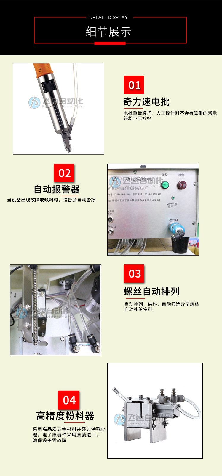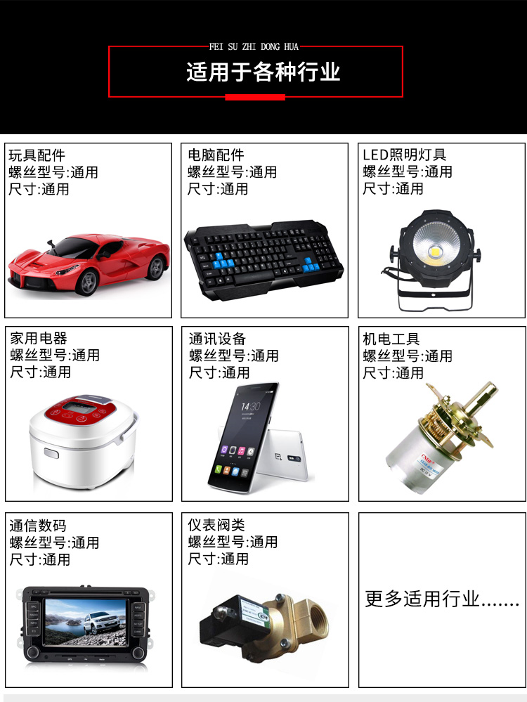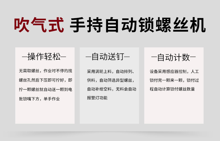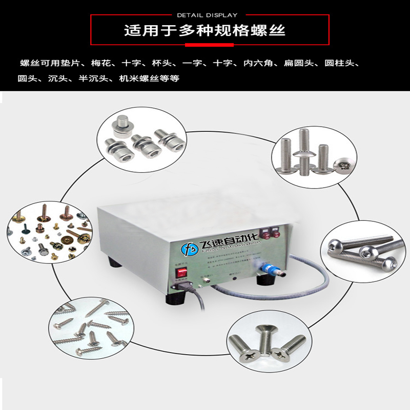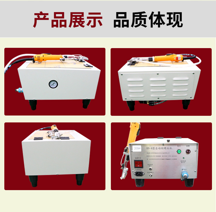 - 產(chǎn)品簡介: 手持式鎖螺絲機優(yōu)點 省成本:單人即可高效操作,省去一名人工。 提效率:1分鐘可鎖60顆螺絲,效率提高1倍。 更輕松:左手無需取螺絲,可用于扶住產(chǎn)品。 更清潔:不再直接接觸螺絲,避免手部接觸造成二次污染而生銹。 形象佳:智能自動化設(shè)備令企業(yè)生產(chǎn)景象一新,樹立企業(yè)高科技形象。 產(chǎn)品適用范圍 1.適用于各種類型的螺絲,螺絲總長應(yīng)大于1.3倍螺帽直徑; 2.支持深孔螺絲鎖付,孔深小于40mm,M1-M6的螺絲; 3.適用于數(shù)碼、電子、小家電、電源開關(guān)、燈具、LED、玩具等產(chǎn)品。