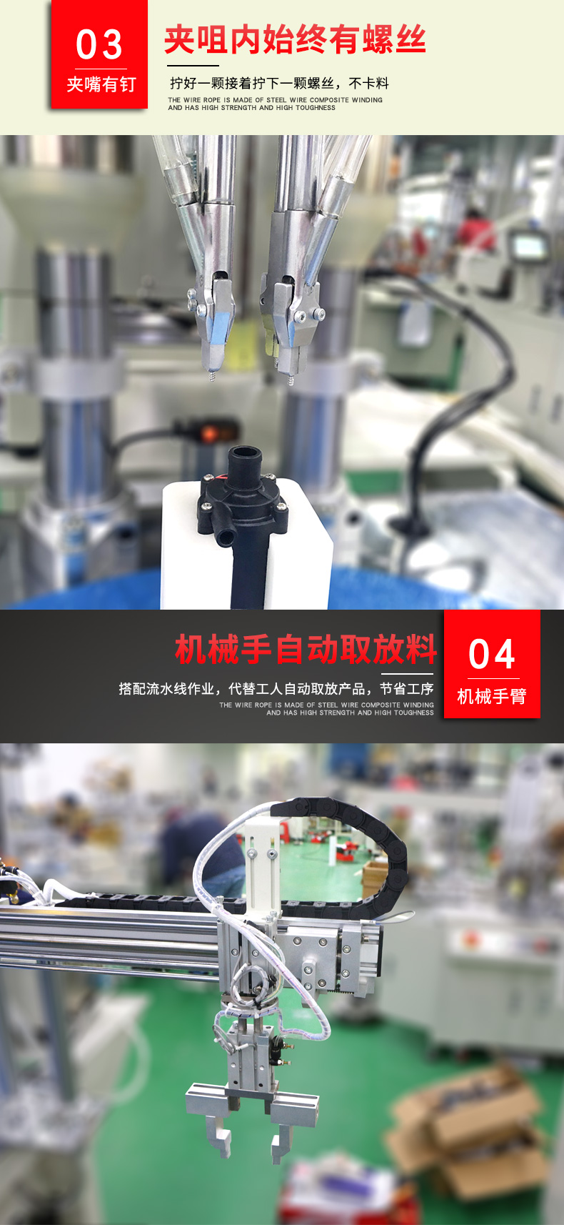 該臺攝像頭自動擰螺絲機,是用來擰攝像頭上面和側面的螺絲。另外根據客戶要求,我們這邊同時搭配了機械臂,通過機械臂將產品轉移至流水線上,方便客戶節(jié)省時間,提高客戶生產產能。